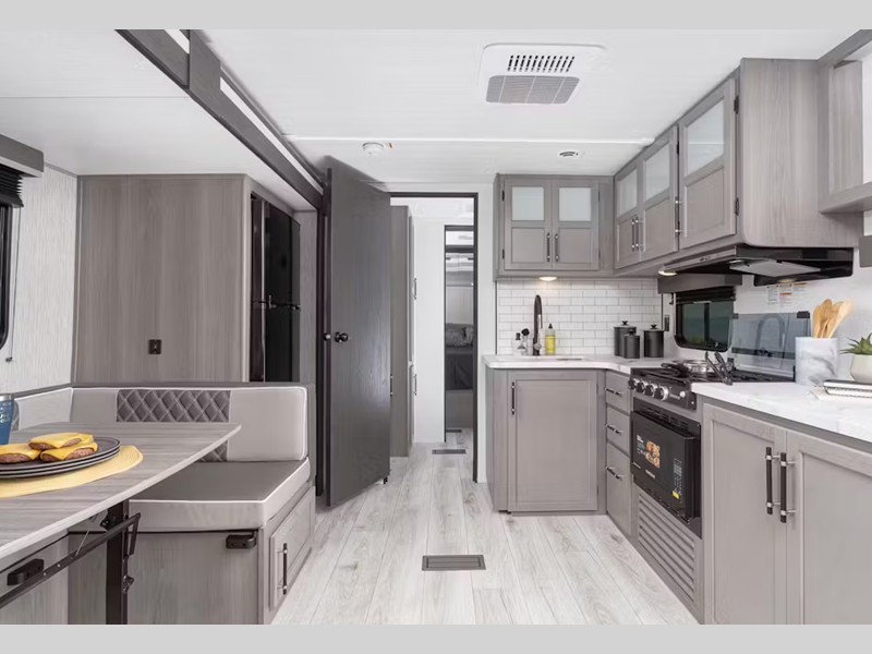 Inside, you'll enjoy blackout night shades, LED lighting, a stainless-steel sink, and pressed membrane premium countertops. The tankless water heater will provide endless hot showers and the 30k BTU furnace will help keep you warm on chilly evenings. Each model is also SolarFlex ready for off-grid capabilities, and there is Furrion backup camera prep for the option to make parking smoother.