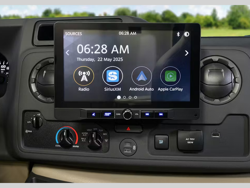 Sleeps 5 Slides 1 Length 26 ft 5 in Ext Width 8 ft 3 in Ext Height 11 ft Int Height 7 ft Interior Color Nantucket Blue ll, Sunlit Silver Exterior Color Standard Graphics Hitch Weight 8000 lbs GVWR 12500 lbs Fresh Water Capacity 41 gals Grey Water Capacity 33 gals Black Water Capacity 30 gals Furnace BTU 30000 btu Generator 4.0 kW Gas Dual Gas/LP Fuel Type Gas Engine 7.3L V8 Chassis Ford E-Series Horsepower 325 hp Fuel Capacity 55 gals Wheelbase 176 in Number Of Bunks 1 Available Beds Two Twin with King Conversion Torque 450 ft-lb Refrigerator Type 12V Convection Cooking Yes Cooktop Burners 2 Shower Size 27" x 27" Number of Awnings 1 LP Tank Capacity 40.9 lbs Water Heater Type Tankless AC BTU 13500 btu Basement Storage 65 cu. ft. TV Info Cab 32" Smart TV Awning Info 17' 6" Power w/Integrated LED Lighting Gross Combined Weight 18500 lbs Shower Type Radius Electrical Service 30 amp Similar Floorplans